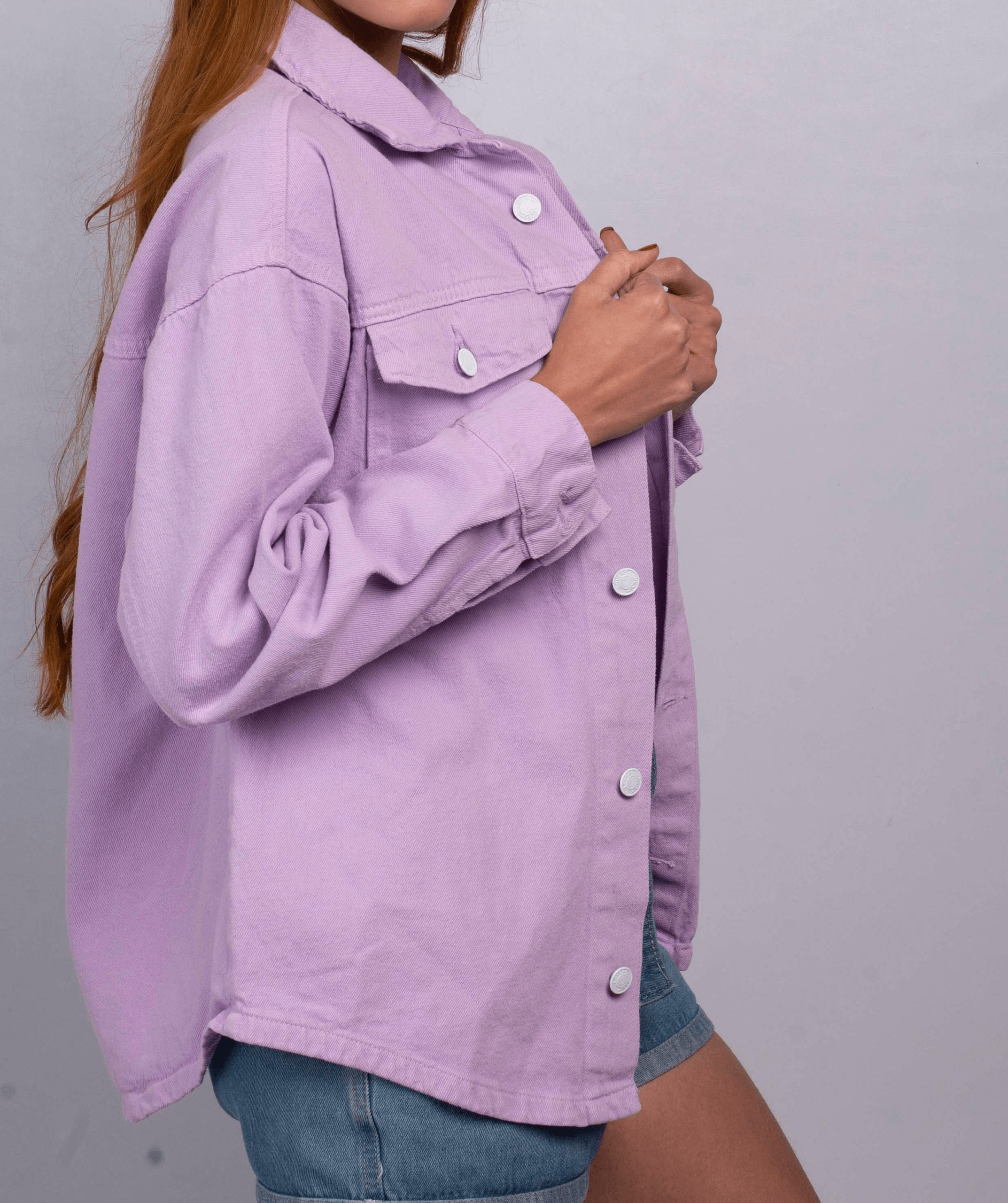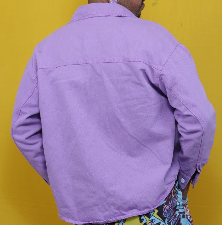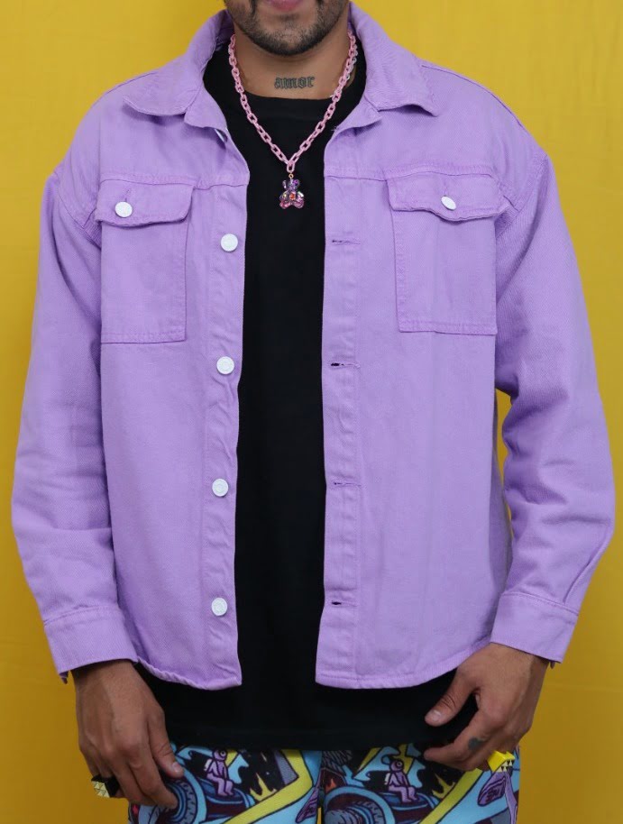 Chaqueta Lila Oversize Unisex, 100% Algodón, con botones blancos y bolsillos. Envío gratis y pago contra entrega en Colombia. Ideal para ocasiones relajadas.