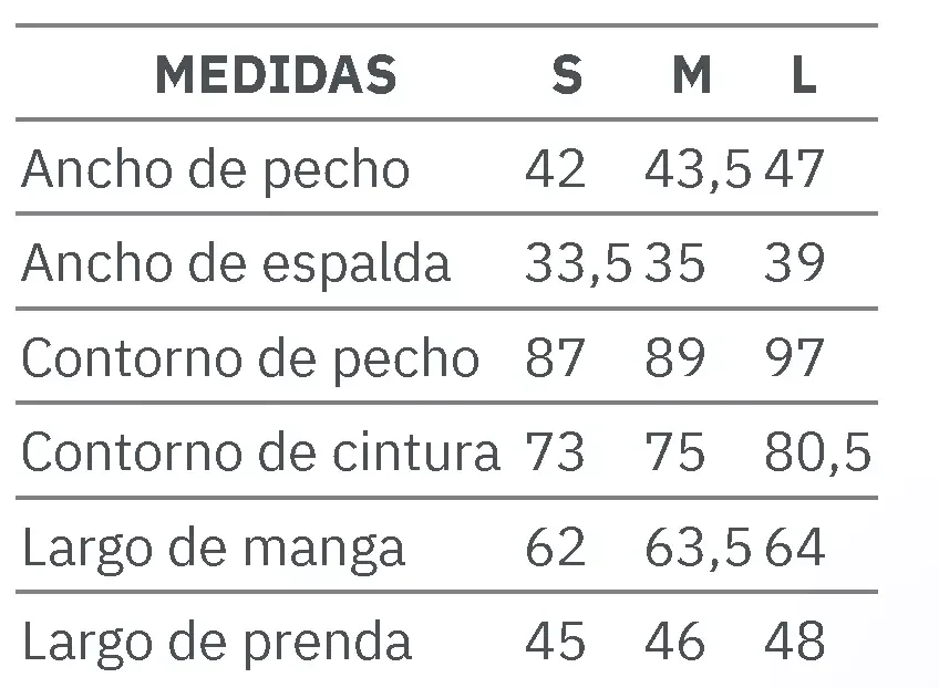 - Cuello, dos bolsillos en el pecho y botones en la parte delantera.