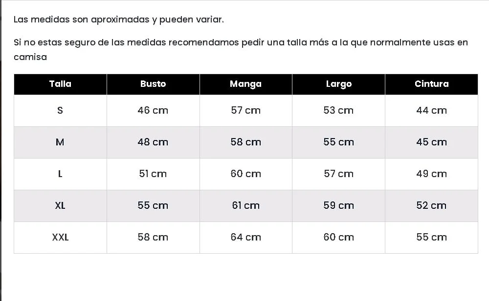 Recomendamos pedir una talla más grande, dependiendo de tu tallaje de blusa. Por ejemplo, si usas una talla M en blusa, te sugerimos elegir una talla L para la chaqueta. Queremos que te sientas cómoda y segura luciendo tu mejor versión.